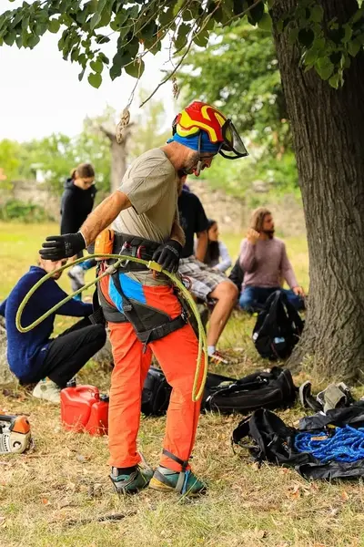 Acordăm o importanță deosebită protecției individuale. Personalizăm planul de protecție a muncii în funcție de specificul fiecărei lucrări. Membrii echipei noastre sunt dotați cu echipamente de protecție dedicate, cum ar fi: - căști pentru arboricultură, prevăzute cu vizieră și antifoane - pantaloni de lucru cu protecție împotriva tăierilor cu ferăstraie mecanice - bocanci arboricoli cu protecție metalică și protecție împotriva tăierilor cu ferăstraie mecanice - truse de prim ajutor pentru uz forestier și arboricol, atât individuale cât și pentru echipa, dotate cu kit de oprire a hemoragiei extreme