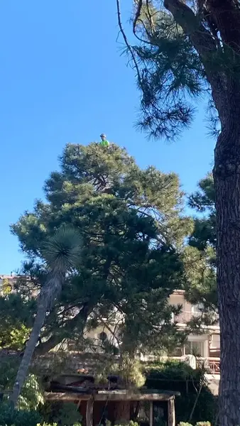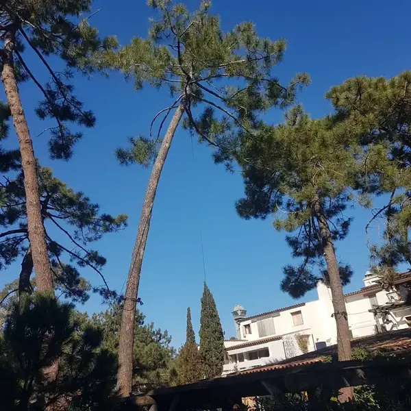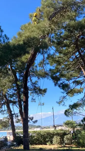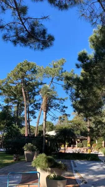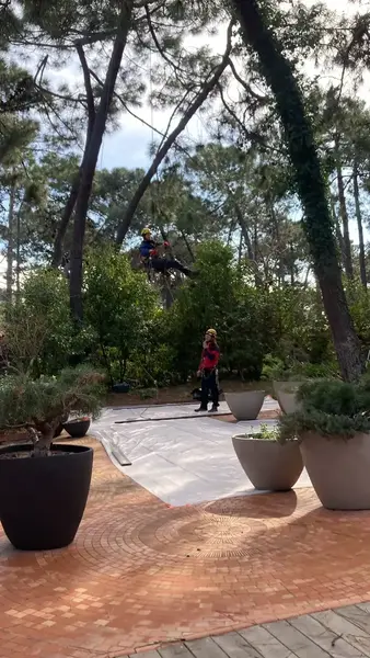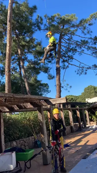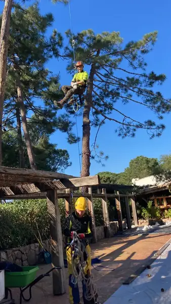 Lucrări de întreținere a arborilor din incinta complexului Grand Hotel Cala Rossa, situat în apropierea orașului Porto Vechio, Corsica.Extragerea masei foliare